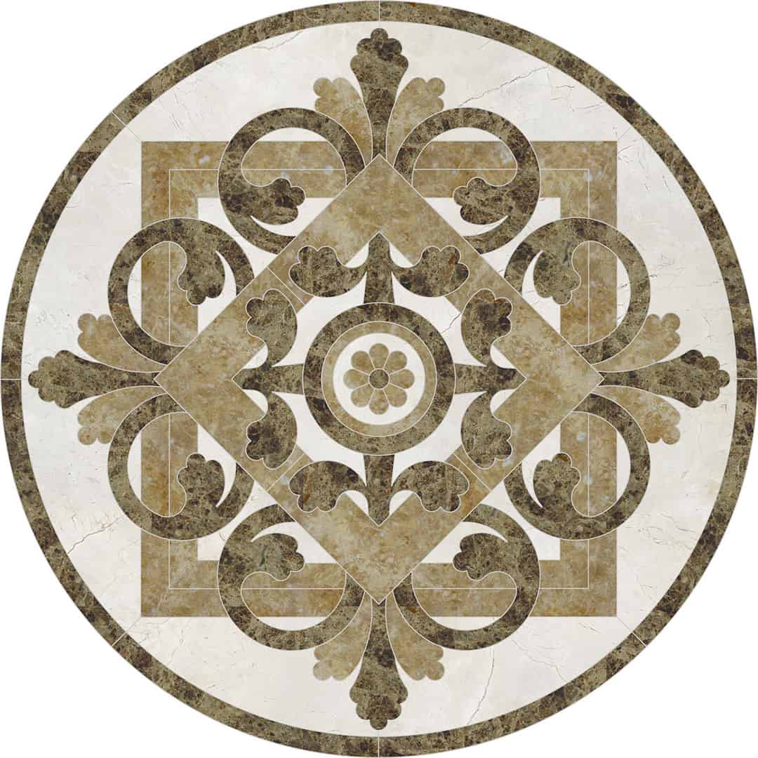 Waterjet cut natural stone medallion, made to order. Cut from 12-inch x 12-inch x 3/8-inch tile (or 1/2-tile or 3/4-inch slab for an additional charge). Production time is 4 – 6 weeks for standard sizes and readily available materials. Cut/grout lines will vary depending on size of design. Above diagram may not reflect actual cut lines of your medallion. Natural stone will vary in color and veining. Color and veining differences are not considered defects. Any samples, pictures, or printouts are only examples of what the medallion may look like.