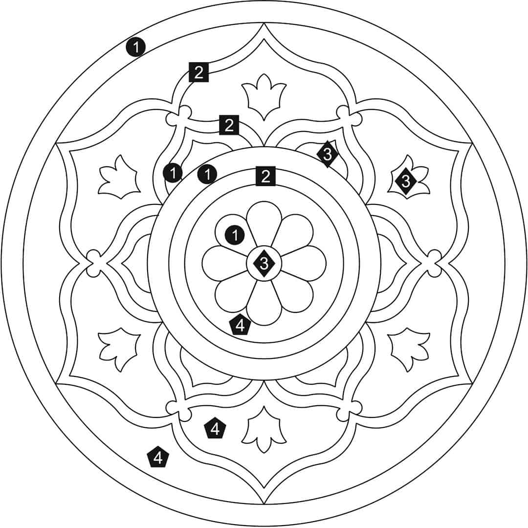 Download a PDF to help with custom configuration. Waterjet cut natural stone medallion, made to order. Cut from 12-inch x 12-inch x 3/8-inch tile (or 1/2-tile or 3/4-inch slab for an additional charge). Production time is 4 – 6 weeks for standard sizes and readily available materials. Cut/grout lines will vary depending on size of design. Above diagram may not reflect actual cut lines of your medallion. Natural stone will vary in color and veining. Color and veining differences are not considered defects. Any samples, pictures, or printouts are only examples of what the medallion may look like.