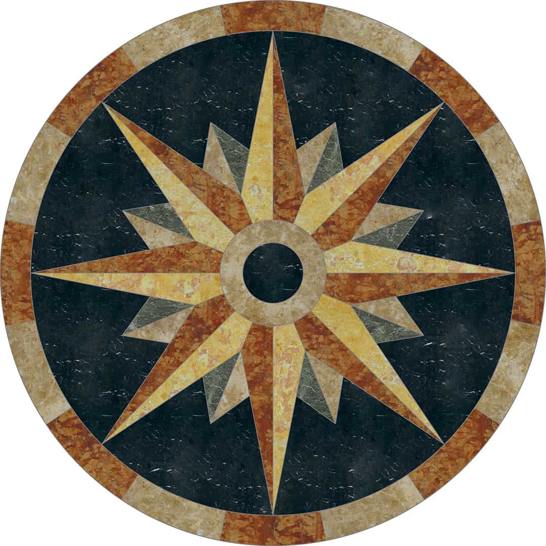 Waterjet cut natural stone medallion, made to order. Cut from 12-inch x 12-inch x 3/8-inch tile (or 1/2-tile or 3/4-inch slab for an additional charge). Production time is 4 – 6 weeks for standard sizes and readily available materials. Cut/grout lines will vary depending on size of design. Above diagram may not reflect actual cut lines of your medallion. Natural stone will vary in color and veining. Color and veining differences are not considered defects. Any samples, pictures, or printouts are only examples of what the medallion may look like.