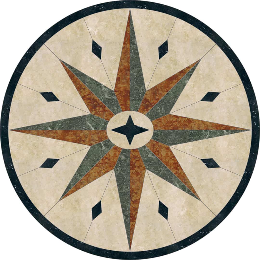 Waterjet cut natural stone medallion, made to order. Cut from 12-inch x 12-inch x 3/8-inch tile (or 1/2-tile or 3/4-inch slab for an additional charge). Production time is 4 – 6 weeks for standard sizes and readily available materials. Cut/grout lines will vary depending on size of design. Above diagram may not reflect actual cut lines of your medallion. Natural stone will vary in color and veining. Color and veining differences are not considered defects. Any samples, pictures, or printouts are only examples of what the medallion may look like.
