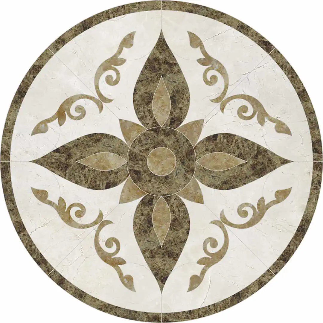 Waterjet cut natural stone medallion, made to order. Cut from 12-inch x 12-inch x 3/8-inch tile (or 1/2-tile or 3/4-inch slab for an additional charge). Production time is 4 – 6 weeks for standard sizes and readily available materials. Cut/grout lines will vary depending on size of design. Above diagram may not reflect actual cut lines of your medallion. Natural stone will vary in color and veining. Color and veining differences are not considered defects. Any samples, pictures, or printouts are only examples of what the medallion may look like.