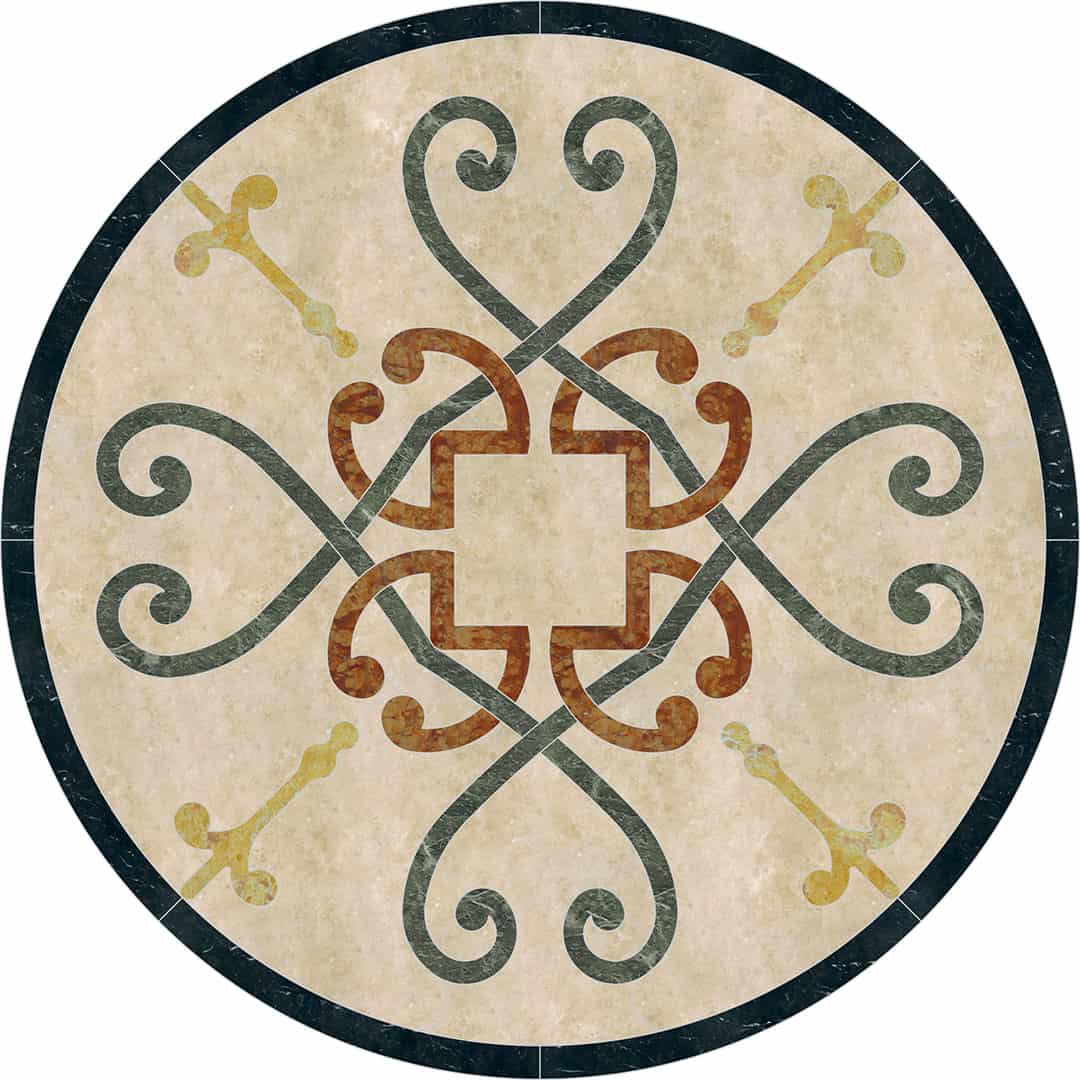 Waterjet cut natural stone medallion, made to order. Cut from 12-inch x 12-inch x 3/8-inch tile (or 1/2-tile or 3/4-inch slab for an additional charge). Production time is 4 – 6 weeks for standard sizes and readily available materials. Cut/grout lines will vary depending on size of design. Above diagram may not reflect actual cut lines of your medallion. Natural stone will vary in color and veining. Color and veining differences are not considered defects. Any samples, pictures, or printouts are only examples of what the medallion may look like.