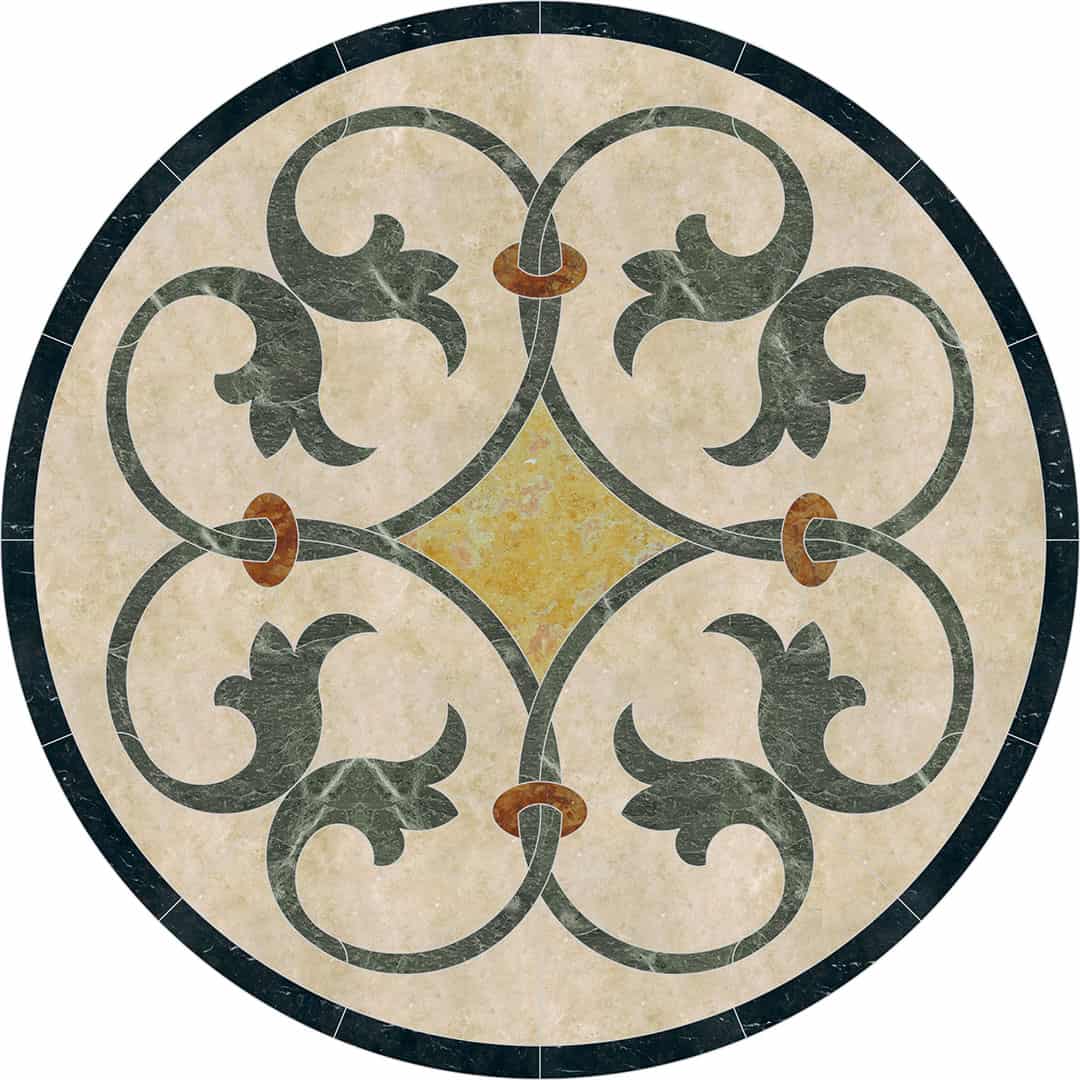 Waterjet cut natural stone medallion, made to order. Cut from 12-inch x 12-inch x 3/8-inch tile (or 1/2-tile or 3/4-inch slab for an additional charge). Production time is 4 – 6 weeks for standard sizes and readily available materials. Cut/grout lines will vary depending on size of design. Above diagram may not reflect actual cut lines of your medallion. Natural stone will vary in color and veining. Color and veining differences are not considered defects. Any samples, pictures, or printouts are only examples of what the medallion may look like.