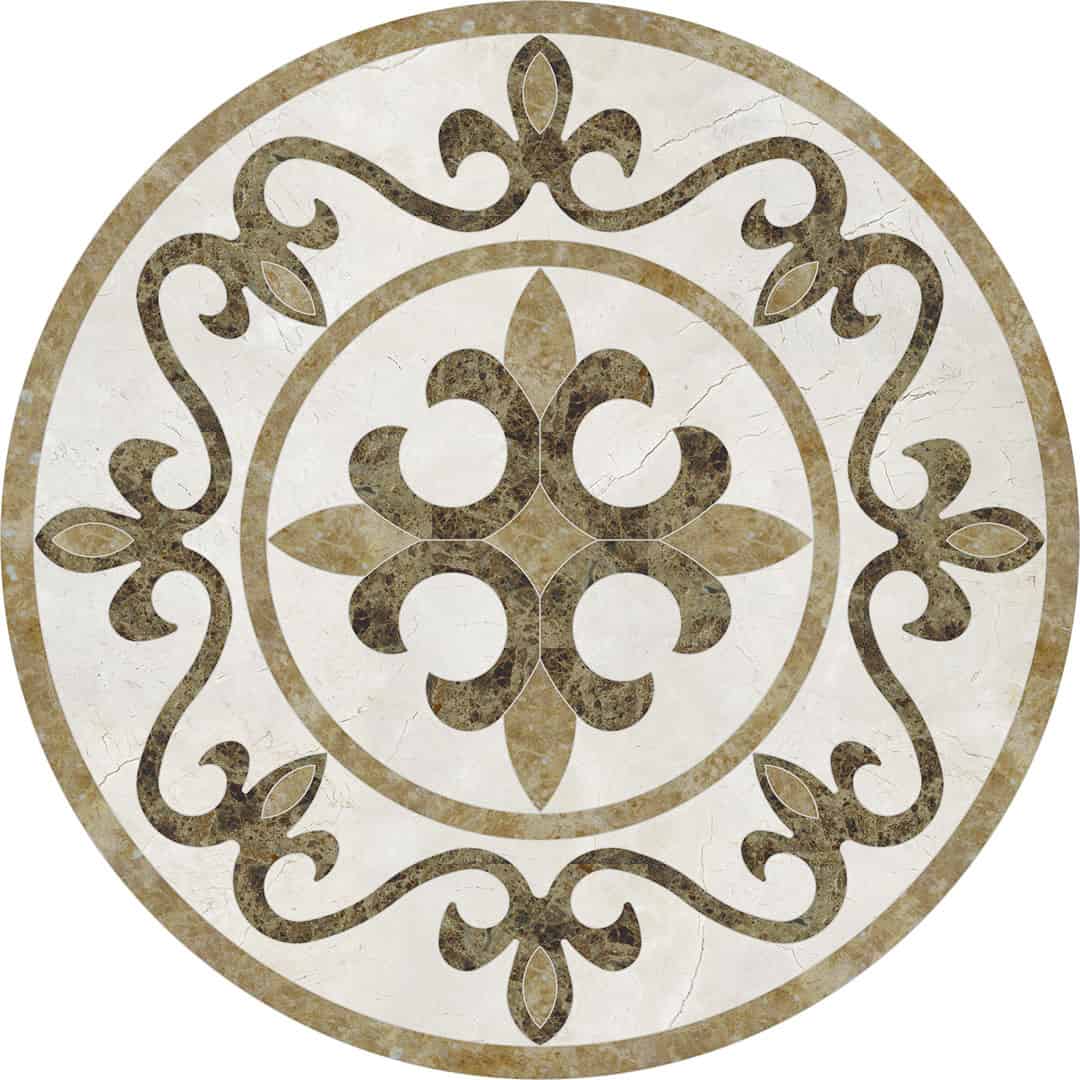 Waterjet cut natural stone medallion, made to order. Cut from 12-inch x 12-inch x 3/8-inch tile (or 1/2-tile or 3/4-inch slab for an additional charge). Production time is 4 – 6 weeks for standard sizes and readily available materials. Cut/grout lines will vary depending on size of design. Above diagram may not reflect actual cut lines of your medallion. Natural stone will vary in color and veining. Color and veining differences are not considered defects. Any samples, pictures, or printouts are only examples of what the medallion may look like.