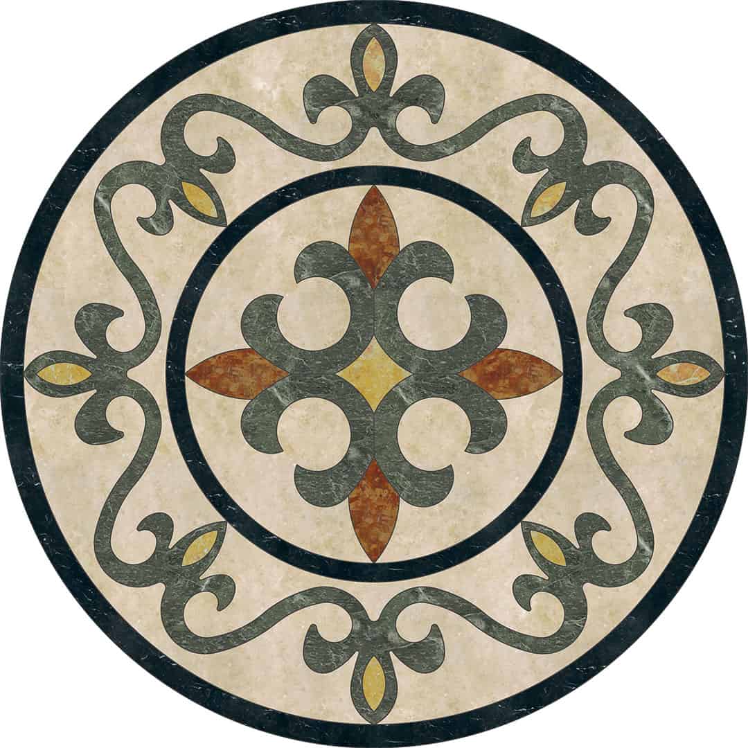 Waterjet cut natural stone medallion, made to order. Cut from 12-inch x 12-inch x 3/8-inch tile (or 1/2-tile or 3/4-inch slab for an additional charge). Production time is 4 – 6 weeks for standard sizes and readily available materials. Cut/grout lines will vary depending on size of design. Above diagram may not reflect actual cut lines of your medallion. Natural stone will vary in color and veining. Color and veining differences are not considered defects. Any samples, pictures, or printouts are only examples of what the medallion may look like.