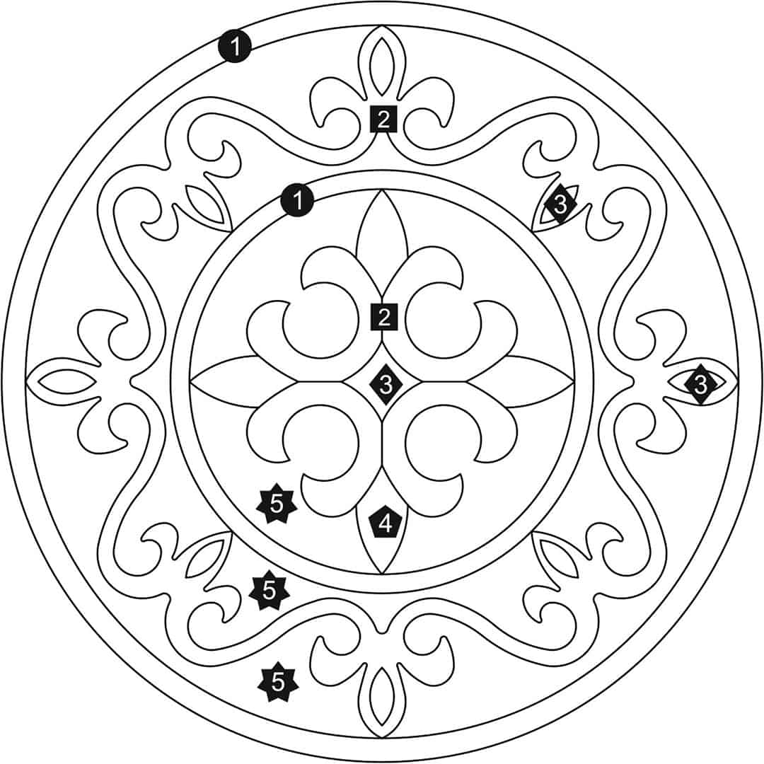 Download a PDF to help with custom configuration. Waterjet cut natural stone medallion, made to order. Cut from 12-inch x 12-inch x 3/8-inch tile (or 1/2-tile or 3/4-inch slab for an additional charge). Production time is 4 – 6 weeks for standard sizes and readily available materials. Cut/grout lines will vary depending on size of design. Above diagram may not reflect actual cut lines of your medallion. Natural stone will vary in color and veining. Color and veining differences are not considered defects. Any samples, pictures, or printouts are only examples of what the medallion may look like.