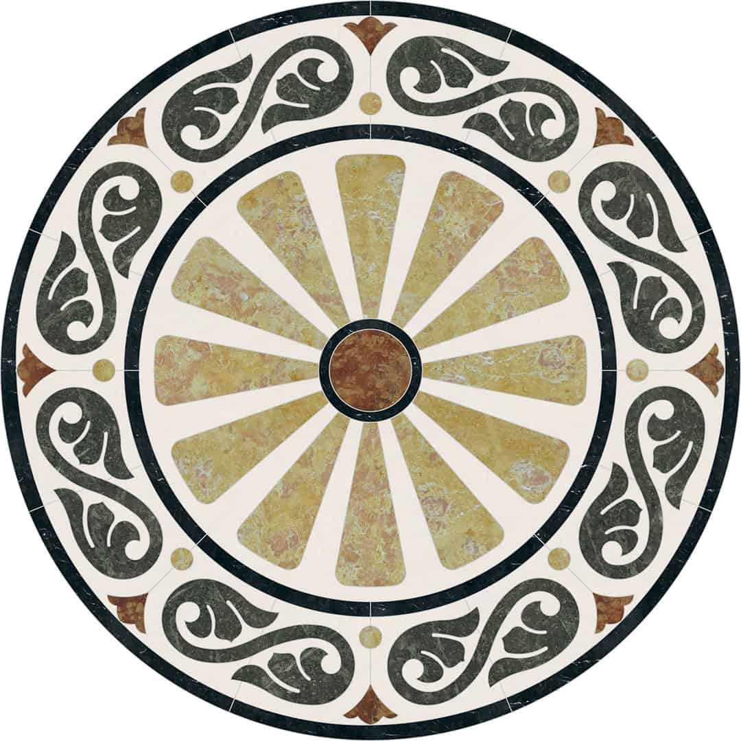 Waterjet cut natural stone medallion, made to order. Cut from 12-inch x 12-inch x 3/8-inch tile (or 1/2-tile or 3/4-inch slab for an additional charge). Production time is 4 – 6 weeks for standard sizes and readily available materials. Cut/grout lines will vary depending on size of design. Above diagram may not reflect actual cut lines of your medallion. Natural stone will vary in color and veining. Color and veining differences are not considered defects. Any samples, pictures, or printouts are only examples of what the medallion may look like.