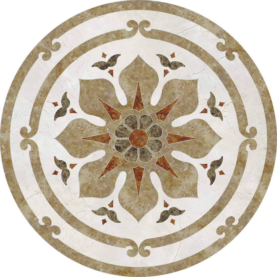 Waterjet cut natural stone medallion, made to order. Cut from 12-inch x 12-inch x 3/8-inch tile (or 1/2-tile or 3/4-inch slab for an additional charge). Production time is 4 – 6 weeks for standard sizes and readily available materials. Cut/grout lines will vary depending on size of design. Above diagram may not reflect actual cut lines of your medallion. Natural stone will vary in color and veining. Color and veining differences are not considered defects. Any samples, pictures, or printouts are only examples of what the medallion may look like.