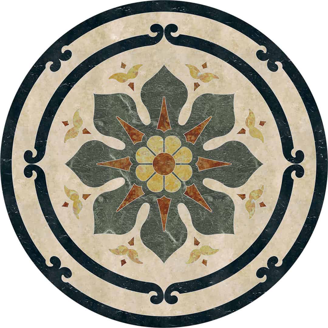 Waterjet cut natural stone medallion, made to order. Cut from 12-inch x 12-inch x 3/8-inch tile (or 1/2-tile or 3/4-inch slab for an additional charge). Production time is 4 – 6 weeks for standard sizes and readily available materials. Cut/grout lines will vary depending on size of design. Above diagram may not reflect actual cut lines of your medallion. Natural stone will vary in color and veining. Color and veining differences are not considered defects. Any samples, pictures, or printouts are only examples of what the medallion may look like.
