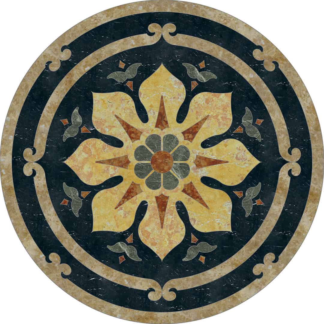 Waterjet cut natural stone medallion, made to order. Cut from 12-inch x 12-inch x 3/8-inch tile (or 1/2-tile or 3/4-inch slab for an additional charge). Production time is 4 – 6 weeks for standard sizes and readily available materials. Cut/grout lines will vary depending on size of design. Above diagram may not reflect actual cut lines of your medallion. Natural stone will vary in color and veining. Color and veining differences are not considered defects. Any samples, pictures, or printouts are only examples of what the medallion may look like.