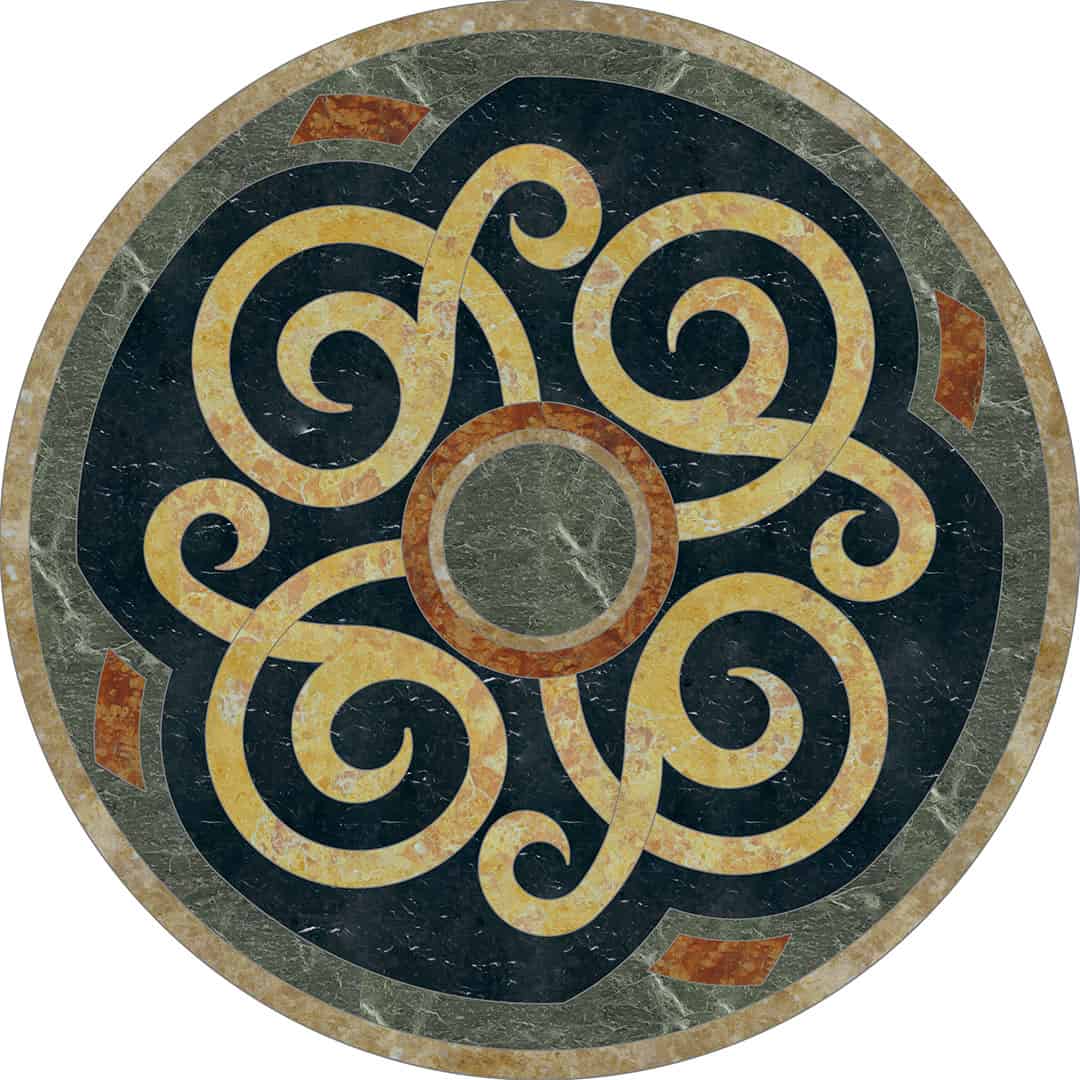 Waterjet cut natural stone medallion, made to order. Cut from 12-inch x 12-inch x 3/8-inch tile (or 1/2-tile or 3/4-inch slab for an additional charge). Production time is 4 – 6 weeks for standard sizes and readily available materials. Cut/grout lines will vary depending on size of design. Above diagram may not reflect actual cut lines of your medallion. Natural stone will vary in color and veining. Color and veining differences are not considered defects. Any samples, pictures, or printouts are only examples of what the medallion may look like.