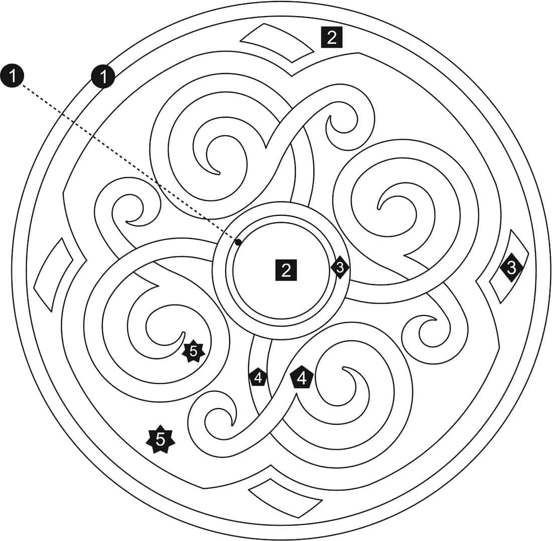 Download a PDF to help with custom configuration. Waterjet cut natural stone medallion, made to order. Cut from 12-inch x 12-inch x 3/8-inch tile (or 1/2-tile or 3/4-inch slab for an additional charge). Production time is 4 – 6 weeks for standard sizes and readily available materials. Cut/grout lines will vary depending on size of design. Above diagram may not reflect actual cut lines of your medallion. Natural stone will vary in color and veining. Color and veining differences are not considered defects. Any samples, pictures, or printouts are only examples of what the medallion may look like.
