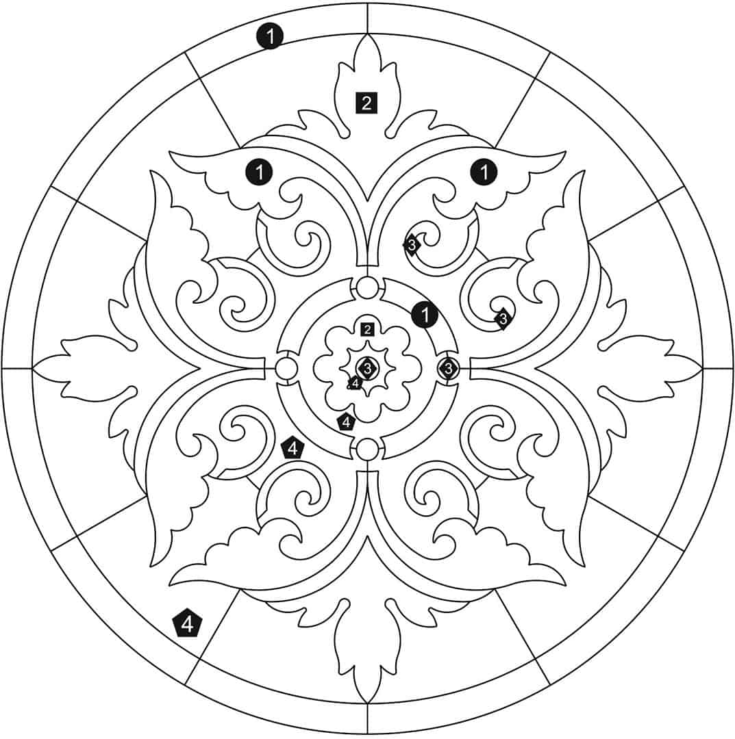 Download a PDF to help with custom configuration. Waterjet cut natural stone medallion, made to order. Cut from 12-inch x 12-inch x 3/8-inch tile (or 1/2-tile or 3/4-inch slab for an additional charge). Production time is 4 – 6 weeks for standard sizes and readily available materials. Cut/grout lines will vary depending on size of design. Above diagram may not reflect actual cut lines of your medallion. Natural stone will vary in color and veining. Color and veining differences are not considered defects. Any samples, pictures, or printouts are only examples of what the medallion may look like.