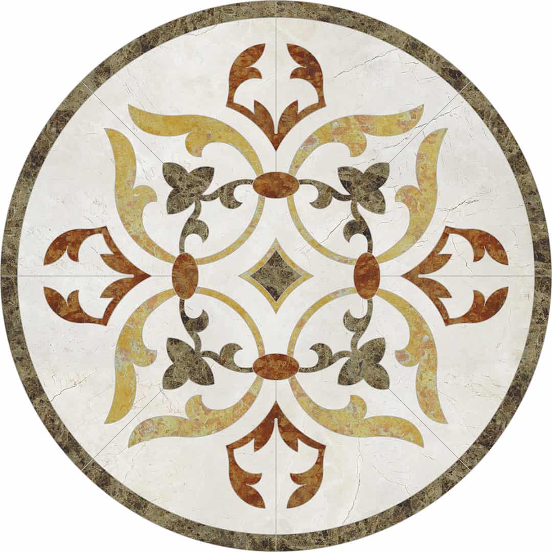Waterjet cut natural stone medallion, made to order. Cut from 12-inch x 12-inch x 3/8-inch tile (or 1/2-tile or 3/4-inch slab for an additional charge). Production time is 4 – 6 weeks for standard sizes and readily available materials. Cut/grout lines will vary depending on size of design. Above diagram may not reflect actual cut lines of your medallion. Natural stone will vary in color and veining. Color and veining differences are not considered defects. Any samples, pictures, or printouts are only examples of what the medallion may look like.