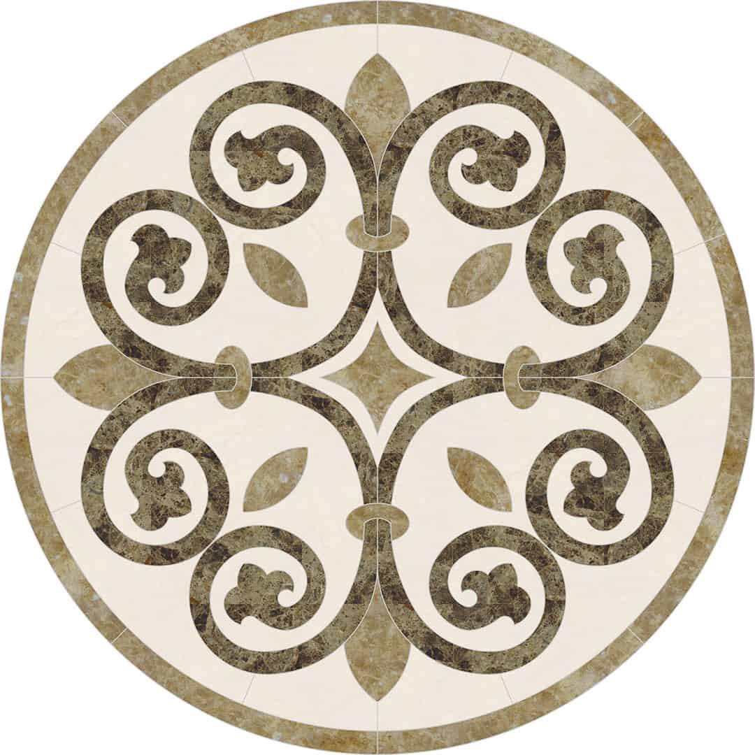 Waterjet cut natural stone medallion, made to order. Cut from 12-inch x 12-inch x 3/8-inch tile (or 1/2-tile or 3/4-inch slab for an additional charge). Production time is 4 – 6 weeks for standard sizes and readily available materials. Cut/grout lines will vary depending on size of design. Above diagram may not reflect actual cut lines of your medallion. Natural stone will vary in color and veining. Color and veining differences are not considered defects. Any samples, pictures, or printouts are only examples of what the medallion may look like.