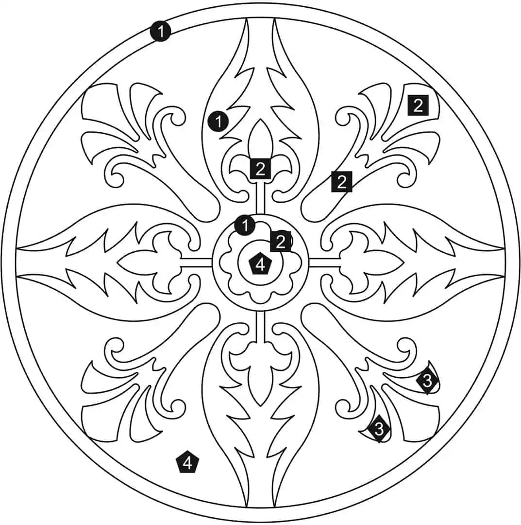 Download a PDF to help with custom configuration. Waterjet cut natural stone medallion, made to order. Cut from 12-inch x 12-inch x 3/8-inch tile (or 1/2-tile or 3/4-inch slab for an additional charge). Production time is 4 – 6 weeks for standard sizes and readily available materials. Cut/grout lines will vary depending on size of design. Above diagram may not reflect actual cut lines of your medallion. Natural stone will vary in color and veining. Color and veining differences are not considered defects. Any samples, pictures, or printouts are only examples of what the medallion may look like.
