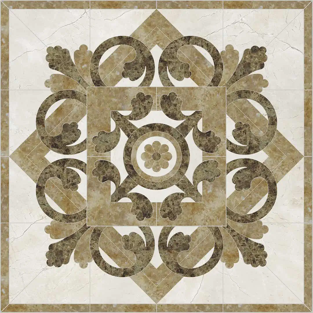 Waterjet cut natural stone medallion, made to order. Cut from 12-inch x 12-inch x 3/8-inch tile (or 1/2-tile or 3/4-inch slab for an additional charge). Production time is 4 – 6 weeks for standard sizes and readily available materials. Cut/grout lines will vary depending on size of design. Above diagram may not reflect actual cut lines of your medallion. Natural stone will vary in color and veining. Color and veining differences are not considered defects. Any samples, pictures, or printouts are only examples of what the medallion may look like.