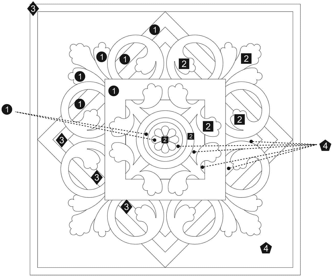 Download a PDF to help with custom configuration. Waterjet cut natural stone medallion, made to order. Cut from 12-inch x 12-inch x 3/8-inch tile (or 1/2-tile or 3/4-inch slab for an additional charge). Production time is 4 – 6 weeks for standard sizes and readily available materials. Cut/grout lines will vary depending on size of design. Above diagram may not reflect actual cut lines of your medallion. Natural stone will vary in color and veining. Color and veining differences are not considered defects. Any samples, pictures, or printouts are only examples of what the medallion may look like.