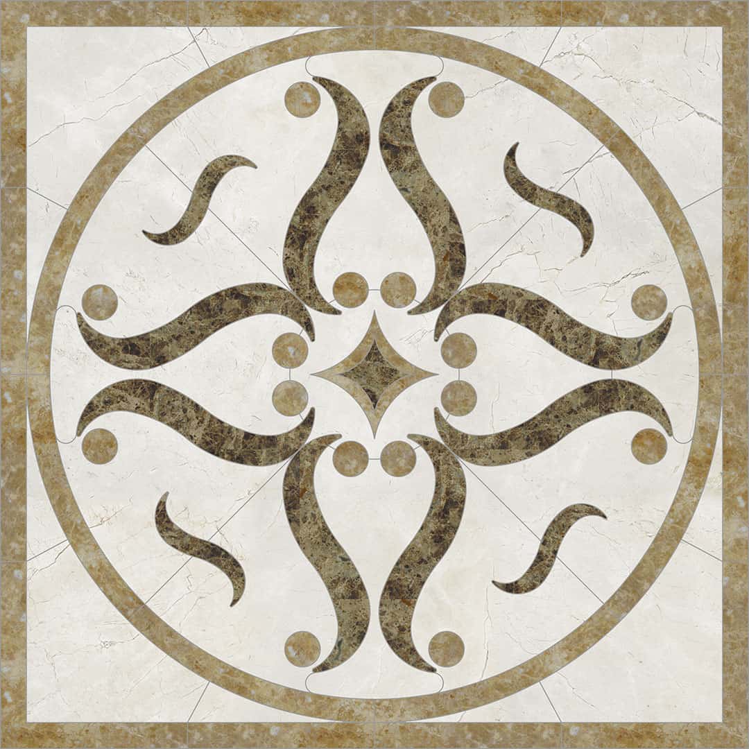 Waterjet cut natural stone medallion, made to order. Cut from 12-inch x 12-inch x 3/8-inch tile (or 1/2-tile or 3/4-inch slab for an additional charge). Production time is 4 – 6 weeks for standard sizes and readily available materials. Cut/grout lines will vary depending on size of design. Above diagram may not reflect actual cut lines of your medallion. Natural stone will vary in color and veining. Color and veining differences are not considered defects. Any samples, pictures, or printouts are only examples of what the medallion may look like.