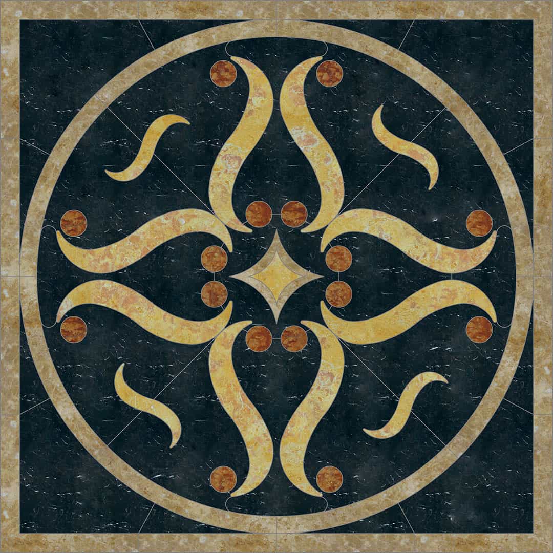 Waterjet cut natural stone medallion, made to order. Cut from 12-inch x 12-inch x 3/8-inch tile (or 1/2-tile or 3/4-inch slab for an additional charge). Production time is 4 – 6 weeks for standard sizes and readily available materials. Cut/grout lines will vary depending on size of design. Above diagram may not reflect actual cut lines of your medallion. Natural stone will vary in color and veining. Color and veining differences are not considered defects. Any samples, pictures, or printouts are only examples of what the medallion may look like.