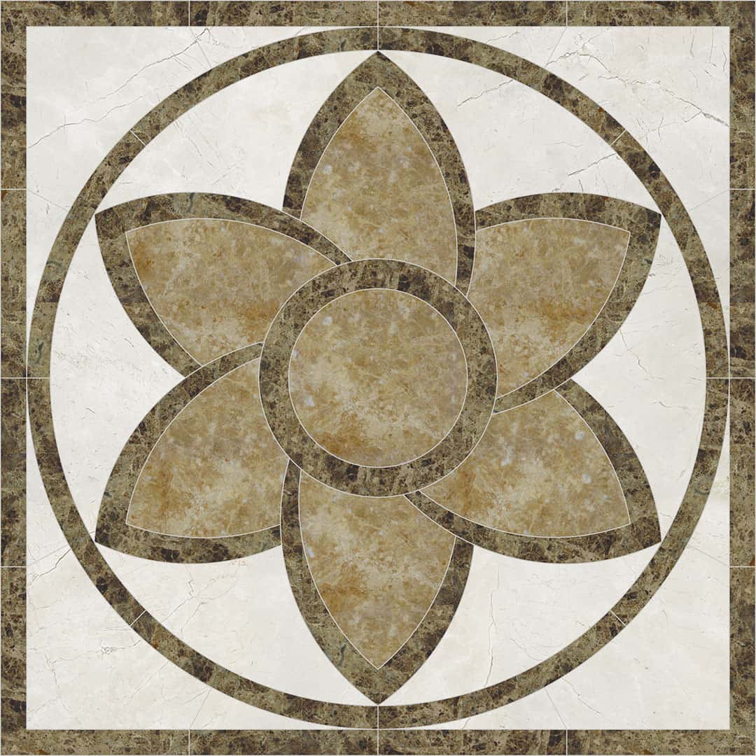 Waterjet cut natural stone medallion, made to order. Cut from 12-inch x 12-inch x 3/8-inch tile (or 1/2-tile or 3/4-inch slab for an additional charge). Production time is 4 – 6 weeks for standard sizes and readily available materials. Cut/grout lines will vary depending on size of design. Above diagram may not reflect actual cut lines of your medallion. Natural stone will vary in color and veining. Color and veining differences are not considered defects. Any samples, pictures, or printouts are only examples of what the medallion may look like.
