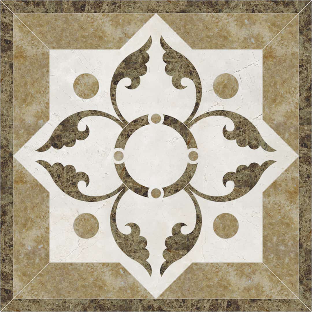 Waterjet cut natural stone medallion, made to order. Cut from 12-inch x 12-inch x 3/8-inch tile (or 1/2-tile or 3/4-inch slab for an additional charge). Production time is 4 – 6 weeks for standard sizes and readily available materials. Cut/grout lines will vary depending on size of design. Above diagram may not reflect actual cut lines of your medallion. Natural stone will vary in color and veining. Color and veining differences are not considered defects. Any samples, pictures, or printouts are only examples of what the medallion may look like.