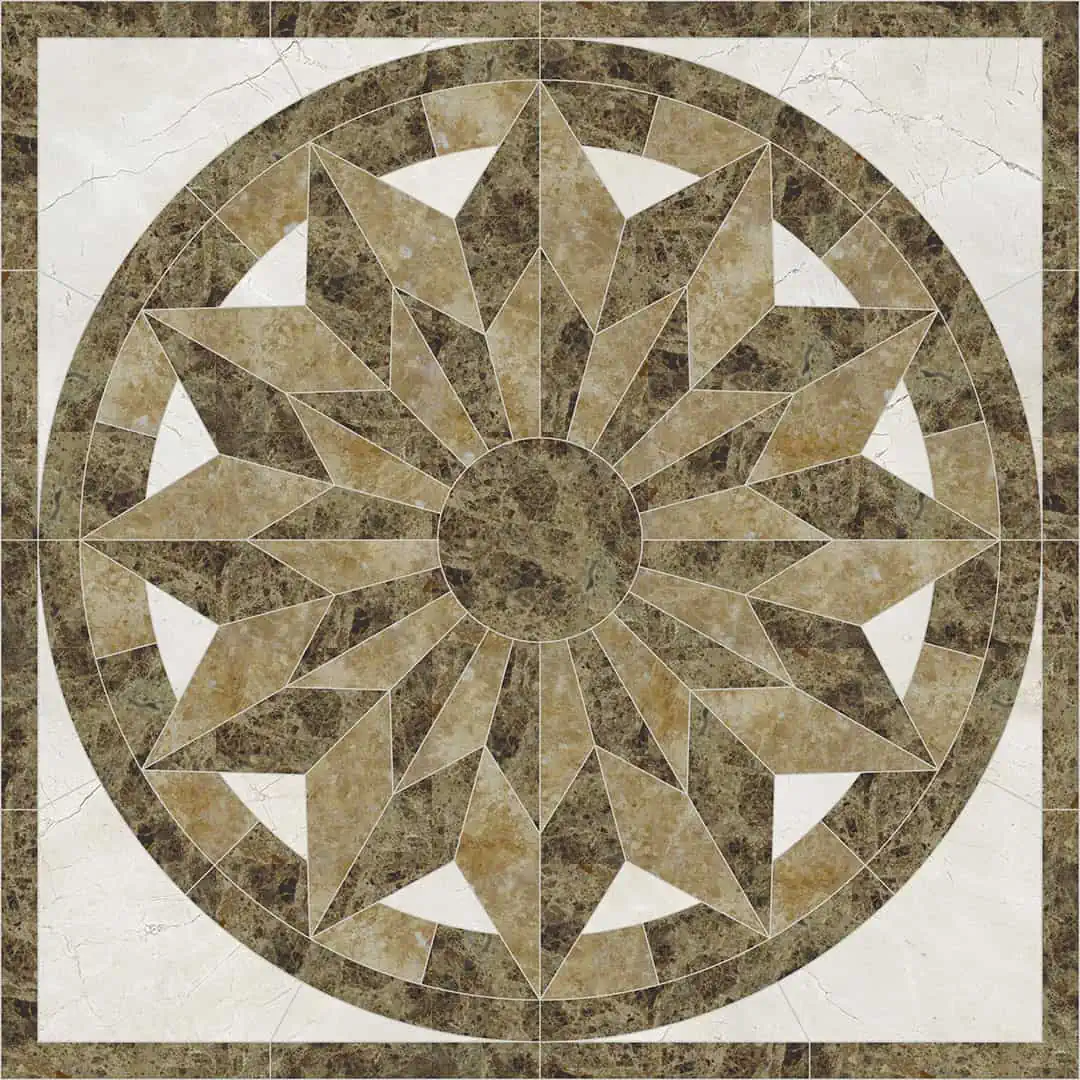 Waterjet cut natural stone medallion, made to order. Cut from 12-inch x 12-inch x 3/8-inch tile (or 1/2-tile or 3/4-inch slab for an additional charge). Production time is 4 – 6 weeks for standard sizes and readily available materials. Cut/grout lines will vary depending on size of design. Above diagram may not reflect actual cut lines of your medallion. Natural stone will vary in color and veining. Color and veining differences are not considered defects. Any samples, pictures, or printouts are only examples of what the medallion may look like.