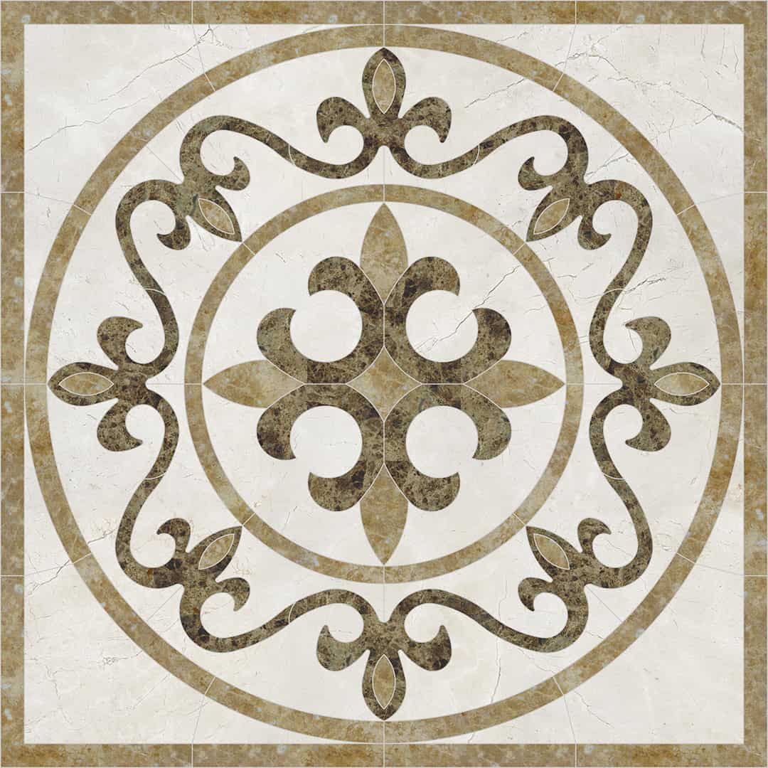 Waterjet cut natural stone medallion, made to order. Cut from 12-inch x 12-inch x 3/8-inch tile (or 1/2-tile or 3/4-inch slab for an additional charge). Production time is 4 – 6 weeks for standard sizes and readily available materials. Cut/grout lines will vary depending on size of design. Above diagram may not reflect actual cut lines of your medallion. Natural stone will vary in color and veining. Color and veining differences are not considered defects. Any samples, pictures, or printouts are only examples of what the medallion may look like.