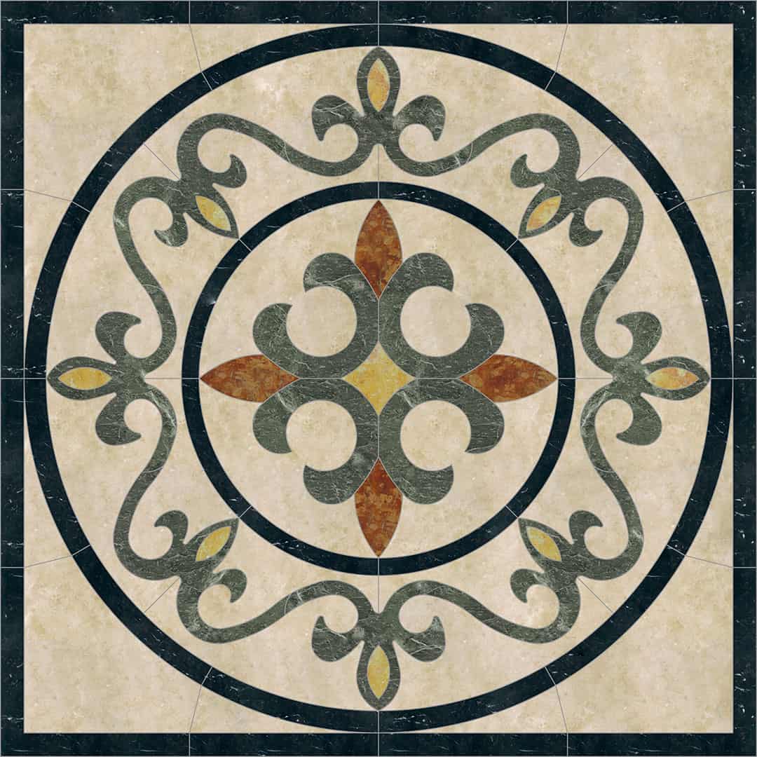 Waterjet cut natural stone medallion, made to order. Cut from 12-inch x 12-inch x 3/8-inch tile (or 1/2-tile or 3/4-inch slab for an additional charge). Production time is 4 – 6 weeks for standard sizes and readily available materials. Cut/grout lines will vary depending on size of design. Above diagram may not reflect actual cut lines of your medallion. Natural stone will vary in color and veining. Color and veining differences are not considered defects. Any samples, pictures, or printouts are only examples of what the medallion may look like.