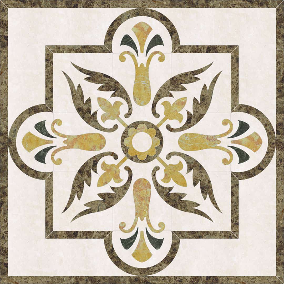 Waterjet cut natural stone medallion, made to order. Cut from 12-inch x 12-inch x 3/8-inch tile (or 1/2-tile or 3/4-inch slab for an additional charge). Production time is 4 – 6 weeks for standard sizes and readily available materials. Cut/grout lines will vary depending on size of design. Above diagram may not reflect actual cut lines of your medallion. Natural stone will vary in color and veining. Color and veining differences are not considered defects. Any samples, pictures, or printouts are only examples of what the medallion may look like.