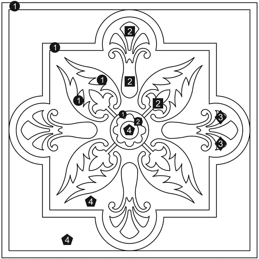 Download a PDF to help with custom configuration. Waterjet cut natural stone medallion, made to order. Cut from 12-inch x 12-inch x 3/8-inch tile (or 1/2-tile or 3/4-inch slab for an additional charge). Production time is 4 – 6 weeks for standard sizes and readily available materials. Cut/grout lines will vary depending on size of design. Above diagram may not reflect actual cut lines of your medallion. Natural stone will vary in color and veining. Color and veining differences are not considered defects. Any samples, pictures, or printouts are only examples of what the medallion may look like.