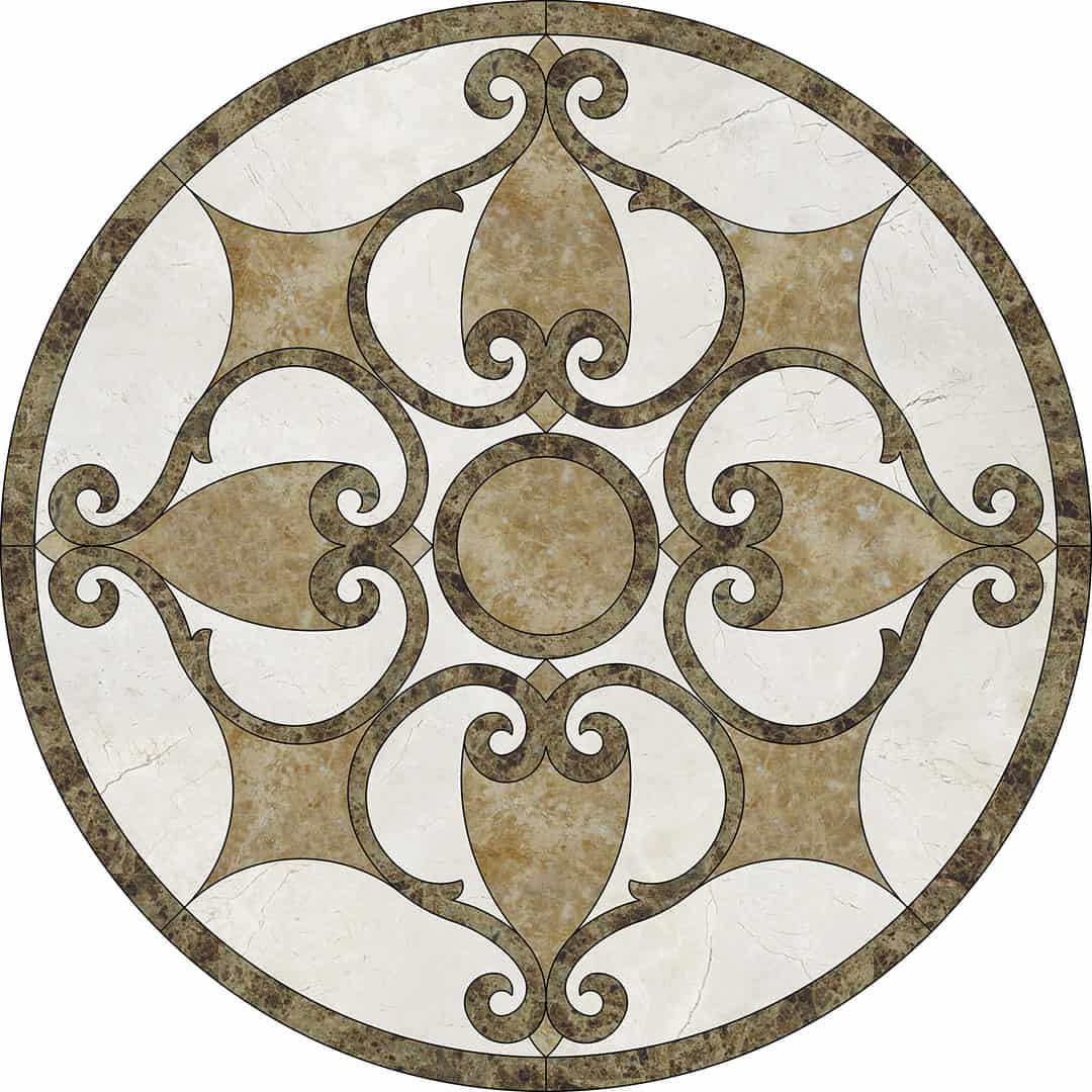 Waterjet cut natural stone medallion, made to order. Cut from 12-inch x 12-inch x 3/8-inch tile (or 1/2-tile or 3/4-inch slab for an additional charge). Production time is 4 – 6 weeks for standard sizes and readily available materials. Cut/grout lines will vary depending on size of design. Above diagram may not reflect actual cut lines of your medallion. Natural stone will vary in color and veining. Color and veining differences are not considered defects. Any samples, pictures, or printouts are only examples of what the medallion may look like.