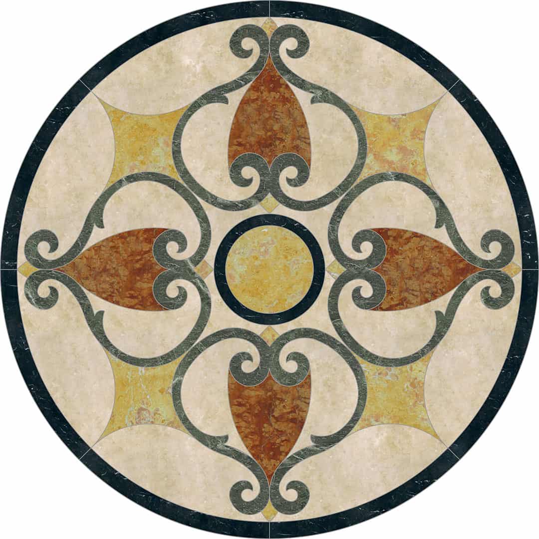 Waterjet cut natural stone medallion, made to order. Cut from 12-inch x 12-inch x 3/8-inch tile (or 1/2-tile or 3/4-inch slab for an additional charge). Production time is 4 – 6 weeks for standard sizes and readily available materials. Cut/grout lines will vary depending on size of design. Above diagram may not reflect actual cut lines of your medallion. Natural stone will vary in color and veining. Color and veining differences are not considered defects. Any samples, pictures, or printouts are only examples of what the medallion may look like.