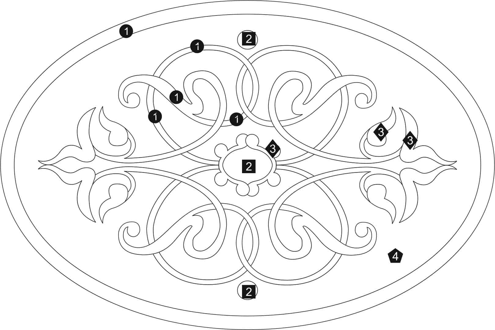 Download a PDF to help with custom configuration. Waterjet cut natural stone medallion, made to order. Cut from 12-inch x 12-inch x 3/8-inch tile (or 1/2-tile or 3/4-inch slab for an additional charge). Production time is 4 – 6 weeks for standard sizes and readily available materials. Cut/grout lines will vary depending on size of design. Above diagram may not reflect actual cut lines of your medallion. Natural stone will vary in color and veining. Color and veining differences are not considered defects. Any samples, pictures, or printouts are only examples of what the medallion may look like.