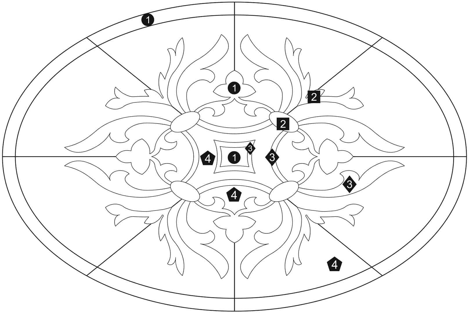 Download a PDF to help with custom configuration. Waterjet cut natural stone medallion, made to order. Cut from 12-inch x 12-inch x 3/8-inch tile (or 1/2-tile or 3/4-inch slab for an additional charge). Production time is 4 – 6 weeks for standard sizes and readily available materials. Cut/grout lines will vary depending on size of design. Above diagram may not reflect actual cut lines of your medallion. Natural stone will vary in color and veining. Color and veining differences are not considered defects. Any samples, pictures, or printouts are only examples of what the medallion may look like.