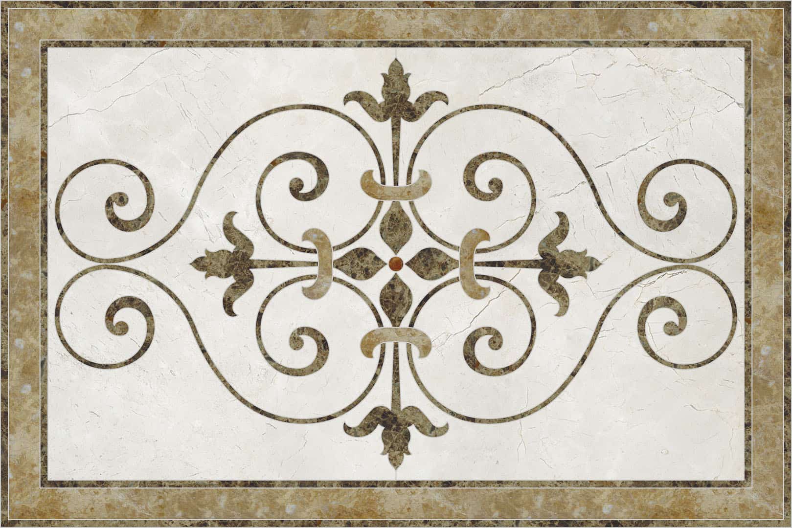 Waterjet cut natural stone medallion, made to order. Cut from 12-inch x 12-inch x 3/8-inch tile (or 1/2-tile or 3/4-inch slab for an additional charge). Production time is 4 – 6 weeks for standard sizes and readily available materials. Cut/grout lines will vary depending on size of design. Above diagram may not reflect actual cut lines of your medallion. Natural stone will vary in color and veining. Color and veining differences are not considered defects. Any samples, pictures, or printouts are only examples of what the medallion may look like.