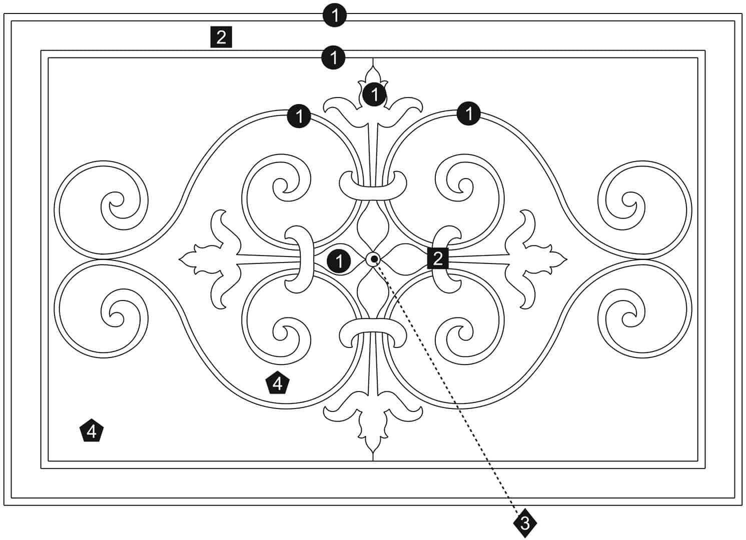 Download a PDF to help with custom configuration. Waterjet cut natural stone medallion, made to order. Cut from 12-inch x 12-inch x 3/8-inch tile (or 1/2-tile or 3/4-inch slab for an additional charge). Production time is 4 – 6 weeks for standard sizes and readily available materials. Cut/grout lines will vary depending on size of design. Above diagram may not reflect actual cut lines of your medallion. Natural stone will vary in color and veining. Color and veining differences are not considered defects. Any samples, pictures, or printouts are only examples of what the medallion may look like.