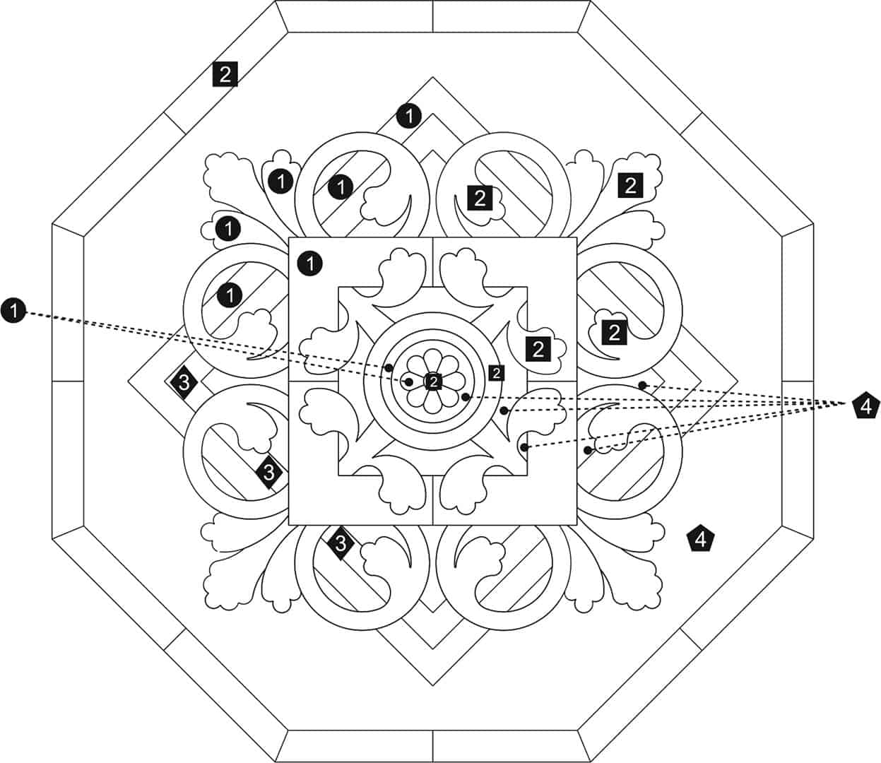 Download a PDF to help with custom configuration. Waterjet cut natural stone medallion, made to order. Cut from 12-inch x 12-inch x 3/8-inch tile (or 1/2-tile or 3/4-inch slab for an additional charge). Production time is 4 – 6 weeks for standard sizes and readily available materials. Cut/grout lines will vary depending on size of design. Above diagram may not reflect actual cut lines of your medallion. Natural stone will vary in color and veining. Color and veining differences are not considered defects. Any samples, pictures, or printouts are only examples of what the medallion may look like.