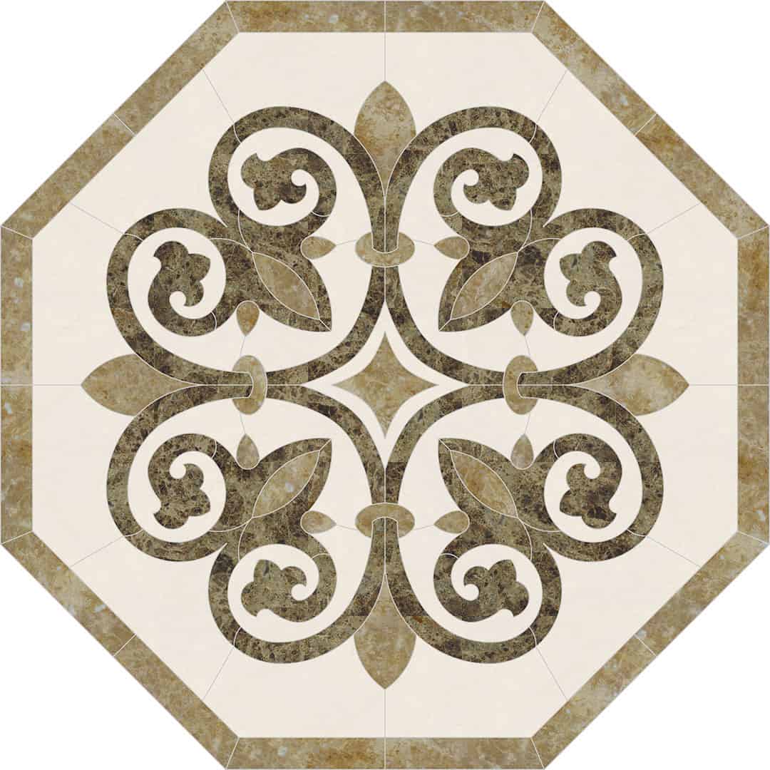 Waterjet cut natural stone medallion, made to order. Cut from 12-inch x 12-inch x 3/8-inch tile (or 1/2-tile or 3/4-inch slab for an additional charge). Production time is 4 – 6 weeks for standard sizes and readily available materials. Cut/grout lines will vary depending on size of design. Above diagram may not reflect actual cut lines of your medallion. Natural stone will vary in color and veining. Color and veining differences are not considered defects. Any samples, pictures, or printouts are only examples of what the medallion may look like.